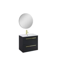De Atlantic badmeubelset Stella met spiegel en witte wastafel 60cm Mat Zwart is een hangende set met een chique uitstraling. Dankzij het hangende design creëer je een ruimtelijke look in jouw badkamer. Het meubel is voorzien van 2 soft close laden en een mat zwarte keramische wastafel. Daarnaast is aan deze set een losse ronde spiegel toegevoegd. De set is voorzien van stijlvolle messing grepen, wat zorgt voor een chique en industrieel uiterlijk. De set wordt flatpacked geleverd en is eenvoudig te installeren met de meegeleverde bevestigingsmaterialen. Exclusief wastafelkraan.