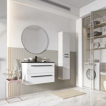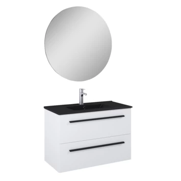 De Atlantic badmeubelset Stella met spiegel en zwarte wastafel 80cm Mat Wit is een hangende set met een chique uitstraling. Dankzij het hangende design creëer je een ruimtelijke look in jouw badkamer. Het meubel is voorzien van 2 soft close laden en een mat zwarte keramische wastafel. Daarnaast is aan deze set een losse ronde spiegel toegevoegd. De set is voorzien van stijlvolle mat zwarte grepen, wat zorgt voor een chique en industrieel uiterlijk. De set wordt flatpacked geleverd en is eenvoudig te installeren met de meegeleverde bevestigingsmaterialen. Exclusief wastafelkraan.